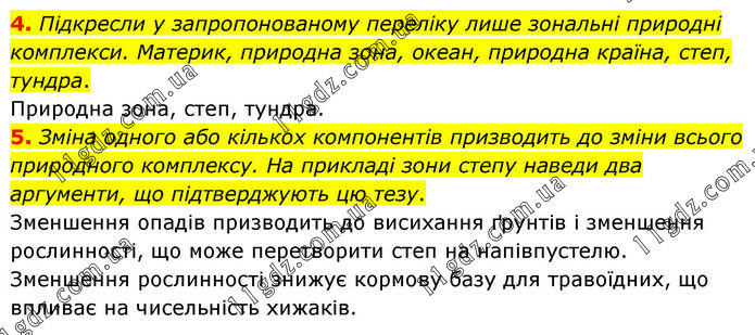 4. Підкресли у запропонованому переліку лише зональні природні комплекси. Материк, природна зона, океан, природна країна, степ, тундра. Природна зона, степ, тундра. 5. Зміна одного або кількох компонентів призводить до зміни всього природного комплексу. На прикладі зони степу наведи два аргументи, що підтверджують цю тезу. Зменшення опадів призводить до висихання ґрунтів і зменшення рослинності, що може перетворити степ на напівпустелю. Зменшення рослинності знижує кормову базу для травоїдних, що впливає на чисельність хижаків.