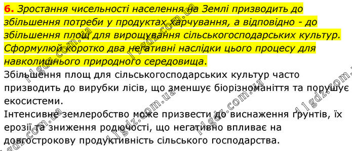 Зростання чисельності населення на Землі призводить до збільшення потреби у продуктах харчування, а відповідно - до збільшення площ для вирощування сільськогосподарських культур. Сформулюй коротко два негативні наслідки цього процесу для навколишнього природного середовища. Збільшення площ для сільськогосподарських культур часто призводить до вирубки лісів, що зменшує біорізноманіття та порушує екосистеми. Інтенсивне землеробство може призвести до виснаження ґрунтів, їх ерозії та зниження родючості, що негативно впливає на довгострокову продуктивність сільського господарства.