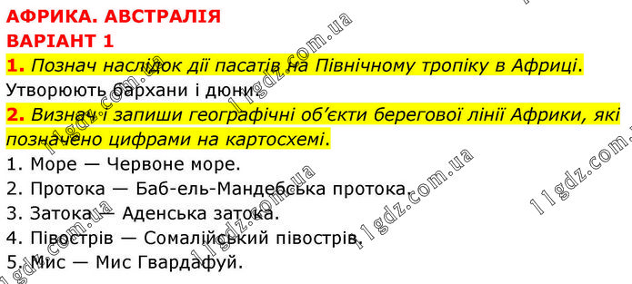АФРИКА. АВСТРАЛІЯ ВАРІАНТ 1 1. Познач наслідок дії пасатів на Північному тропіку в Африці. Утворюють бархани і дюни. 2. Визнач і запиши географічні об’єкти берегової лінії Африки, які позначено цифрами на картосхемі. 1. Море — Червоне море. 2. Протока — Баб-ель-Мандебська протока. 3. Затока — Аденська затока. 4. Півострів — Сомалійський півострів. 5. Мис — Мис Гвардафуй.