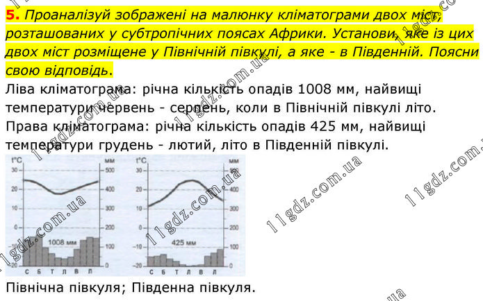 Проаналізуй зображені на малюнку кліматограми двох міст, розташованих у субтропічних поясах Африки. Установи, яке із цих двох міст розміщене у Північній півкулі, а яке - в Південній. Поясни свою відповідь. Ліва кліматограма: річна кількість опадів 1008 мм, найвищі температури червень - серпень, коли в Північній півкулі літо. Права кліматограма: річна кількість опадів 425 мм, найвищі температури грудень - лютий, літо в Південній півкулі. Північна півкуля; Південна півкуля.