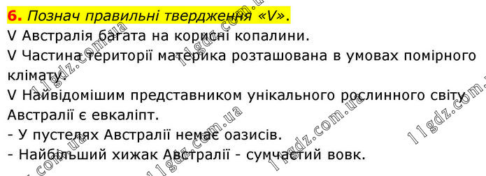 Познач правильні твердження «V». V Австралія багата на корисні копалини. V Частина території материка розташована в умовах помірного клімату. V Найвідомішим представником унікального рослинного світу Австралії є евкаліпт. - У пустелях Австралії немає оазисів. - Найбільший хижак Австралії - сумчастий вовк.