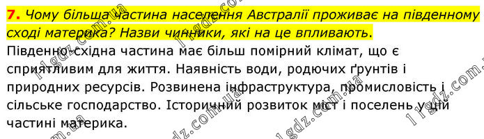 Чому більша частина населення Австралії проживає на південному сході материка? Назви чинники, які на це впливають. Південно-східна частина має більш помірний клімат, що є сприятливим для життя. Наявність води, родючих ґрунтів і природних ресурсів. Розвинена інфраструктура, промисловість і сільське господарство. Історичний розвиток міст і поселень у цій частині материка.