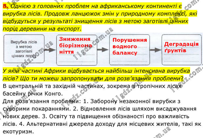 Однією з головних проблем на африканському континенті є вирубка лісів. Продовж ланцюжок змін у природному комплексі, які відбудуться у результаті знищення лісів з метою заготівлі цінних порід деревини на експорт. У якій частині Африки відбувається найбільш інтенсивна вирубка лісів? Що ти можеш запропонувати для розв’язання проблеми? В центральній та західній частинах, зокрема в тропічних лісах басейну річки Конго. Для розв’язання проблеми: 1. Заборону незаконної вирубки з суворими покараннями. 2. Відновлення лісів шляхом висаджування нових дерев. 3. Освіту та підвищення обізнаності про важливість лісів. 4. Альтернативні джерела доходу для місцевих жителів, такі як екотуризм.