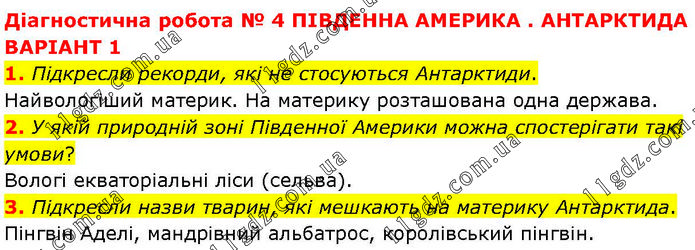 Діагностична робота № 4 ПІВДЕННА АМЕРИКА. АНТАРКТИДА ВАРІАНТ 1 1. Підкресли рекорди, які не стосуються Антарктиди. Найвологіший материк. На материку розташована одна держава. 2. У якій природній зоні Південної Америки можна спостерігати такі умови? Вологі екваторіальні ліси (сельва). 3. Підкресли назви тварин, які мешкають на материку Антарктида. Пінгвін Аделі, мандрівний альбатрос, королівський пінгвін.