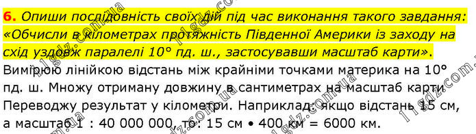 Опиши послідовність своїх дій під час виконання такого завдання: «Обчисли в кілометрах протяжність Південної Америки із заходу на схід уздовж паралелі 10° пд. ш., застосувавши масштаб карти». Вимірюю лінійкою відстань між крайніми точками материка на 10° пд. ш. Множу отриману довжину в сантиметрах на масштаб карти Переводжу результат у кілометри. Наприклад: якщо відстань 15 см, а масштаб 1 : 40 000 000, то: 15 см • 400 км = 6000 км.