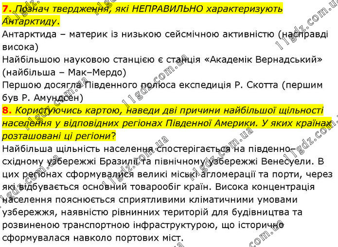 7. Познач твердження, які НЕПРАВИЛЬНО характеризують Антарктиду. Антарктида – материк із низькою сейсмічною активністю (насправді висока) Найбільшою науковою станцією є станція «Академік Вернадський» (найбільша – Мак–Мердо) Першою досягла Південного полюса експедиція Р. Скотта (першим був Р. Амундсен) 8. Користуючись картою, наведи дві причини найбільшої щільності населення у відповідних регіонах Південної Америки. У яких країнах розташовані ці регіони? Найбільша щільність населення спостерігається на південно–східному узбережжі Бразилії та північному узбережжі Венесуели. В цих регіонах сформувалися великі міські агломерації та порти, через які відбувається основний товарообіг країн. Висока концентрація населення пояснюється сприятливими кліматичними умовами узбережжя, наявністю рівнинних територій для будівництва та розвиненою транспортною інфраструктурою, що історично сформувалася навколо портових міст.
