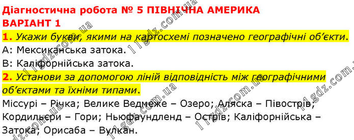 Діагностична робота № 5 ПІВНІЧНА АМЕРИКА ВАРІАНТ 1 1. Укажи букви, якими на картосхемі позначено географічні об’єкти. A: Мексиканська затока. B: Каліфорнійська затока. 2. Установи за допомогою ліній відповідність між географічними об’єктами та їхніми типами. Міссурі – Річка; Велике Ведмеже – Озеро; Аляска – Півострів; Кордильєри – Гори; Ньюфаундленд – Острів; Каліфорнійська – Затока; Орисаба – Вулкан.