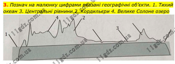 Познач на малюнку цифрами вказані географічні об’єкти. 1. Тихий океан 3. Центральні рівнини 2. Кордильєри 4. Велике Солоне озеро