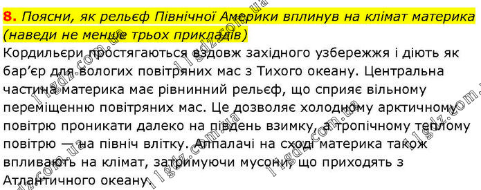 Поясни, як рельєф Північної Америки вплинув на клімат материка (наведи не менше трьох прикладів) Кордильєри простягаються вздовж західного узбережжя і діють як бар’єр для вологих повітряних мас з Тихого океану. Центральна частина материка має рівнинний рельєф, що сприяє вільному переміщенню повітряних мас. Це дозволяє холодному арктичному повітрю проникати далеко на південь взимку, а тропічному теплому повітрю — на північ влітку. Аппалачі на сході материка також впливають на клімат, затримуючи мусони, що приходять з Атлантичного океану.
