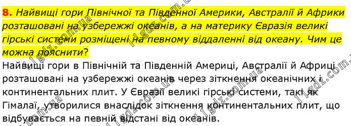 Найвищі гори Північної та Південної Америки, Австралії й Африки розташовані на узбережжі океанів, а на материку Євразія великі гірські системи розміщені на певному віддаленні від океану. Чим це можна пояснити? Найвищі гори в Північній та Південній Америці, Австралії й Африці розташовані на узбережжі океанів через зіткнення океанічних і континентальних плит. У Євразії великі гірські системи, такі як Гімалаї, утворилися внаслідок зіткнення континентальних плит, що відбувається на певній відстані від океанів.