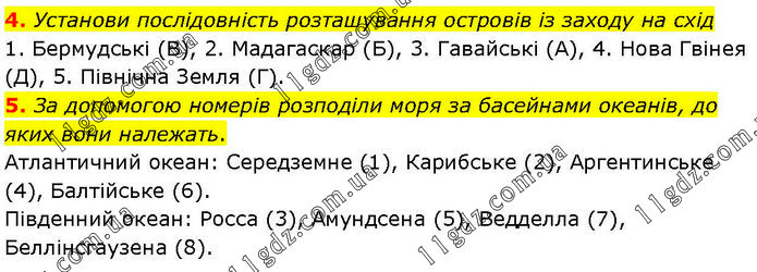 4. Установи послідовність розташування островів із заходу на схід 1. Бермудські (B), 2. Мадагаскар (Б), 3. Гавайські (A), 4. Нова Гвінея (Д), 5. Північна Земля (Г). 5. За допомогою номерів розподіли моря за басейнами океанів, до яких вони належать. Атлантичний океан: Середземне (1), Карибське (2), Аргентинське (4), Балтійське (6). Південний океан: Росса (3), Амундсена (5), Ведделла (7), Беллінсгаузена (8).