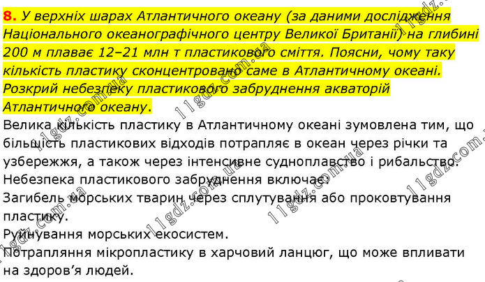У верхніх шарах Атлантичного океану (за даними дослідження Національного океанографічного центру Великої Британії) на глибині 200 м плаває 12–21 млн т пластикового сміття. Поясни, чому таку кількість пластику сконцентровано саме в Атлантичному океані. Розкрий небезпеку пластикового забруднення акваторій Атлантичного океану. Велика кількість пластику в Атлантичному океані зумовлена тим, що більшість пластикових відходів потрапляє в океан через річки та узбережжя, а також через інтенсивне судноплавство і рибальство. Небезпека пластикового забруднення включає: Загибель морських тварин через сплутування або проковтування пластику. Руйнування морських екосистем. Потрапляння мікропластику в харчовий ланцюг, що може впливати на здоров’я людей.
