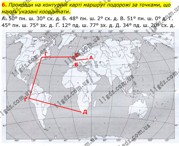 Проклади на контурній карті маршрут подорожі за точками, що мають указані координати. A. 50° пн. ш. 30° сх. д. Б. 48° пн. ш. 2° сх. д. B. 51° пн. ш. 0° д. Г. 45° пн. ш. 75° зх. д. Ґ. 12° пд. ш. 77° зх. д. Д. 34° пд. ш. 20° сх. д.