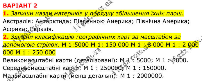 1. Запиши назви материків у порядку збільшення їхніх площ. Австралія; Антарктида; Південною Америка; Північна Америка; Африка; Євразія. 2. Здійсни класифікацію географічних карт за масштабом за допомогою стрілок. М 1:5000 М 1: 150 000 М 1 : 8 000 М 1 : 2 000 000 М 1 : 250 000 Великомасштабні карти (деталізовані): М 1 : 5000; М 1 : 8000. Середньомасштабні карти: М 1 : 250000; М 1 : 150000. Маломасштабні карти (менш детальні): М 1 : 2000000.