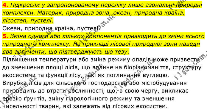 4. Підкресли у запропонованому переліку лише азональні природні комплекси. Материк, природна зона, океан, природна країна, лісостеп, пустелі. Океан, природна країна, пустелі. 5. Зміна одного або кількох компонентів призводить до зміни всього природного комплексу. На прикладі лісової природної зони наведи два аргументи, що підтверджують цю тезу. Підвищення температури або зміна режиму опадів може призвести до зменшення площі лісів, що вплине на біорізноманіття, структуру екосистеми та функції лісу, такі як поглинання вуглецю. Вирубка лісів для сільського господарства або містобудування призводить до втрати рослинності, що, в свою чергу, викликає ерозію ґрунтів, зміну гідрологічного режиму та зменшення чисельності тварин, які залежать від лісових екосистем.
