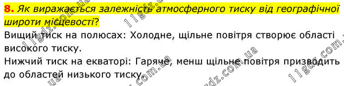Як виражається залежність атмосферного тиску від географічної широти місцевості? Вищий тиск на полюсах: Холодне, щільне повітря створює області високого тиску. Нижчий тиск на екваторі: Гаряче, менш щільне повітря призводить до областей низького тиску.