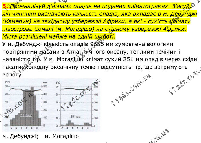 Проаналізуй діаграми опадів на поданих кліматограмах. З’ясуй, які чинники визначають кількість опадів, яка випадає в м. Дебунджі (Камерун) на західному узбережжі Африки, а які - сухість клімату півострова Сомалі (м. Могадішо) на східному узбережжі Африки. Міста розміщені майже на одній широті. У м. Дебунджі кількість опадів 9655 мм зумовлена вологими повітряними масами з Атлантичного океану, теплими течіями і наявністю гір. У м. Могадішо клімат сухий 251 мм опадів через східні пасати, холодну океанічну течію і відсутність гір, що затримують вологу. м. Дебунджі; м. Могадішо.