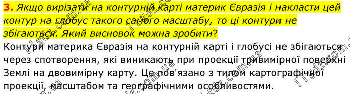 Якщо вирізати на контурній карті материк Євразія і накласти цей контур на глобус такого самого масштабу, то ці контури не збігаються. Який висновок можна зробити? Контури материка Євразія на контурній карті і глобусі не збігаються через спотворення, які виникають при проекції тривимірної поверхні Землі на двовимірну карту. Це пов'язано з типом картографічної проекції, масштабом та географічними особливостями.