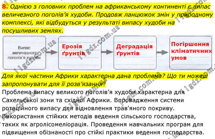 Однією з головних проблем на африканському континенті є випас величезного поголів’я худоби. Продовж ланцюжок змін у природному комплексі, які відбудуться у результаті випасу худоби на посушливих землях. Для якої частини Африки характерна дана проблема? Що ти можеш запропонувати для її розв’язання? Проблема випасу великого поголів’я худоби характерна для Сахельської зони та східної Африки. Впровадження системи ротаційного випасу для відновлення трав'яного покриву. Використання стійких методів ведення сільського господарства, таких як агролісомеліорація. Проведення навчальних програм для підвищення обізнаності про стійкі практики ведення господарства.