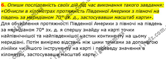 Опиши послідовність своїх дій під час виконання такого завдання: «Обчисли в кілометрах протяжність Південної Америки з півночі на південь за меридіаном 70° зх. д., застосувавши масштаб карти». Для обчислення протяжності Південної Америки з півночі на південь за меридіаном 70° зх. д. я спершу знайду на карті точки найпівнічнішої та найпівденнішої частин континенту на цьому меридіані. Потім виміряю відстань між цими точками за допомогою лінійки чи іншого інструменту на карті і переведу значення в кілометри, застосувавши масштаб карти.