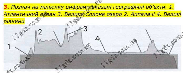 Познач на малюнку цифрами вказані географічні об’єкти. 1. Атлантичний океан 3. Велике Солоне озеро 2. Аппалачі 4. Великі рівнини