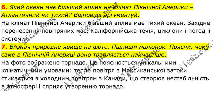 6. Який океан має більший вплив на клімат Північної Америки – Атлантичний чи Тихий? Відповідь аргументуй. На клімат Північної Америки більший вплив має Тихий океан. Західне перенесення повітряних мас, Каліфорнійська течія, циклони і погодні системи. 7. Визнач природне явище на фото. Підпиши малюнок. Поясни, чому саме в Північній Америці воно трапляється найчастіше. На фото зображено торнадо. Це пояснюється унікальними кліматичними умовами: тепле повітря з Мексиканської затоки стикається з холодним повітрям з Канади, що створює нестабільність в атмосфері і сприяє утворенню торнадо.