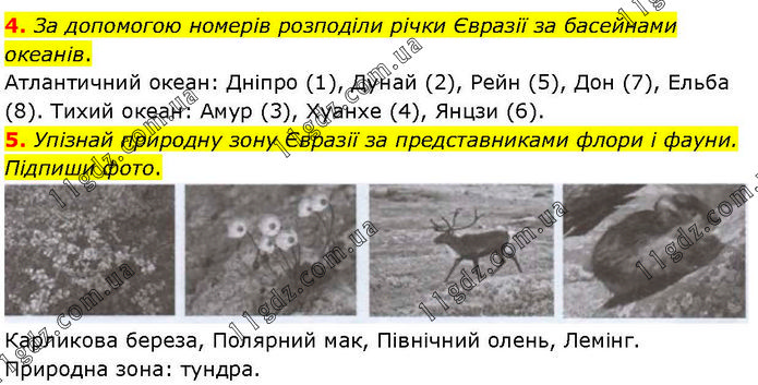 4. За допомогою номерів розподіли річки Євразії за басейнами океанів. Атлантичний океан: Дніпро (1), Дунай (2), Рейн (5), Дон (7), Ельба (8). Тихий океан: Амур (3), Хуанхе (4), Янцзи (6). 5. Упізнай природну зону Євразії за представниками флори і фауни. Підпиши фото. Карликова береза, Полярний мак, Північний олень, Лемінг. Природна зона: тундра.