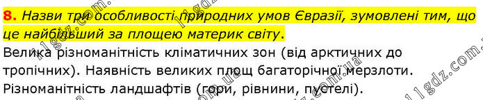 Назви три особливості природних умов Євразії, зумовлені тим, що це найбільший за площею материк світу. Велика різноманітність кліматичних зон (від арктичних до тропічних). Наявність великих площ багаторічної мерзлоти. Різноманітність ландшафтів (гори, рівнини, пустелі).