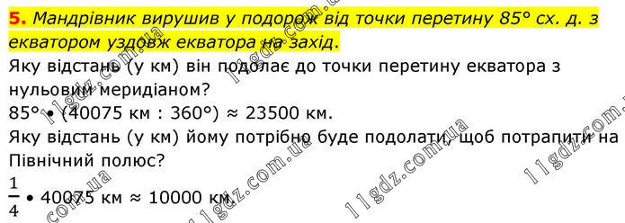 Мандрівник вирушив у подорож від точки перетину 85° сх. д. з екватором уздовж екватора на захід. Яку відстань (у км) він подолає до точки перетину екватора з нульовим меридіаном? 85° • (40075 км : 360°) ≈ 23500 км. Яку відстань (у км) йому потрібно буде подолати, щоб потрапити на Північний полюс? 1/4 • 40075 км ≈ 10000 км.