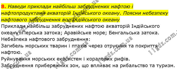 Наведи приклади найбільш забруднених нафтою і нафтопродуктами акваторій Індійського океану. Поясни небезпеку нафтового забруднення вод Індійського океану Приклади найбільш забруднених нафтою акваторій Індійського океану: Перська затока; Аравійське море; Бенгальська затока. Небезпека нафтового забруднення: Загибель морських тварин і птахів через отруєння та покриття нафтою. Руйнування морських екосистем і коралових рифів. Забруднення прибережних зон, що впливає на рибальство та туризм.
