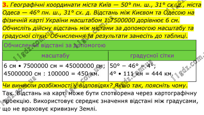 Географічні координати міста Київ — 50° пн. ш., 31° сх. д., міста Одеса — 46° пн. ш., 31° сх. д. Відстань між Києвом та Одесою на фізичній карті України масштабом 1:7500000 дорівнює 6 см. Обчисліть дійсну відстань між містами за допомогою масштабу та градусної сітки. Обчислення та результати занесіть до таблиці. Обчислення відстані за допомогою масштабу градусної сітки 6 см • 7500000 см = 45000000 см; 45000000 см : 100000 = 450 км. 50° − 46° = 4°; 4° • 111 км = 444 км. Чи виникли розбіжності у відповідях? Якшо так, поясніть чому. Так. Відстань на карті може бути спотворена через картографічну проекцію. Використовує середнє значення відстані між градусами, що не враховує кривизну Землі.
