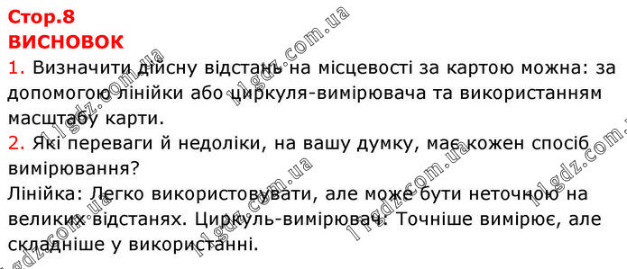 ВИСНОВОК 1. Визначити дійсну відстань на місцевості за картою можна: за допомогою лінійки або циркуля-вимірювача та використанням масштабу карти. 2. Які переваги й недоліки, на вашу думку, має кожен спосіб вимірювання? Лінійка: Легко використовувати, але може бути неточною на великих відстанях. Циркуль-вимірювач: Точніше вимірює, але складніше у використанні.
