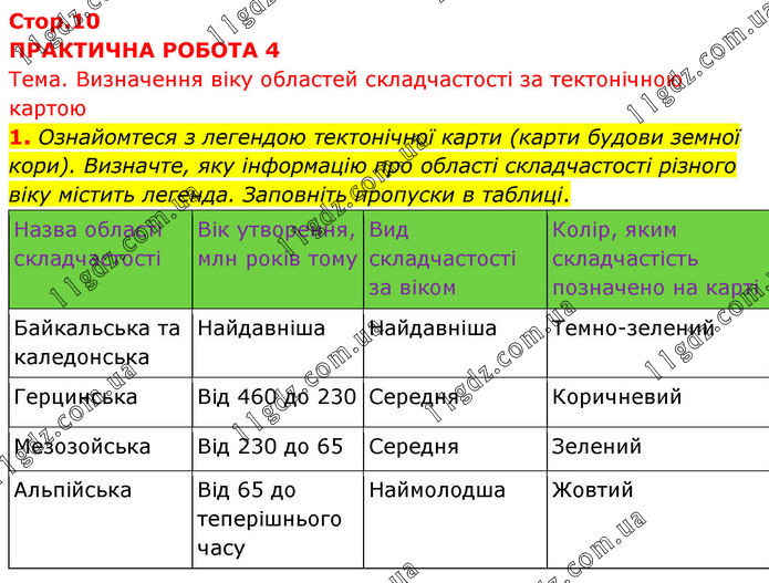 ПРАКТИЧНА РОБОТА 4 Тема. Визначення віку областей складчастості за тектонічною картою 1. Ознайомтеся з легендою тектонічної карти (карти будови земної кори). Визначте, яку інформацію про області складчастості різного віку містить легенда. Заповніть пропуски в таблиці. Назва області складчастості Вік утворення, млн років тому Вид складчастості за віком Колір, яким складчастість позначено на карті Байкальська та каледонська Найдавніша Найдавніша Темно-зелений Герцинська Від 460 до 230 Середня Коричневий Мезозойська Від 230 до 65 Середня Зелений Альпійська Від 65 до теперішнього часу Наймолодша Жовтий