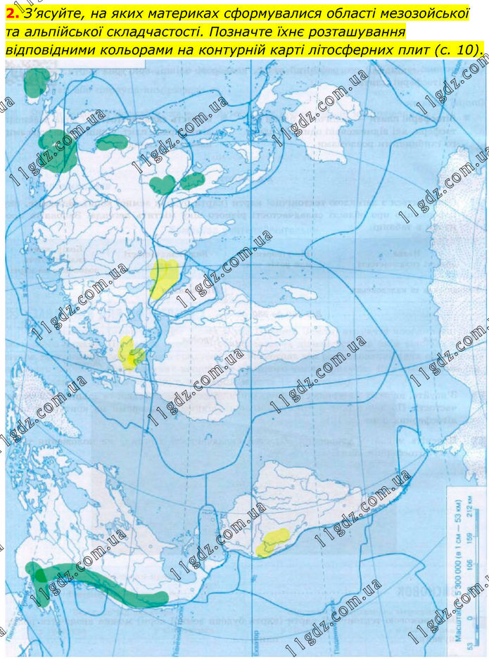 З’ясуйте, на яких материках сформувалися області мезозойської та альпійської складчастості. Позначте їхнє розташування відповідними кольорами на контурній карті літосферних плит (с. 10).