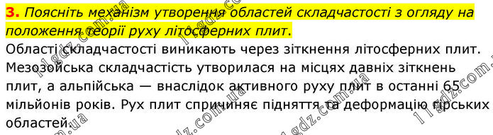 Поясніть механізм утворення областей складчастості з огляду на положення теорії руху літосферних плит. Області складчастості виникають через зіткнення літосферних плит. Мезозойська складчастість утворилася на місцях давніх зіткнень плит, а альпійська — внаслідок активного руху плит в останні 65 мільйонів років. Рух плит спричиняє підняття та деформацію гірських областей.