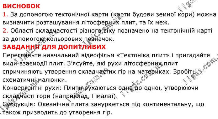 ВИСНОВОК 1. За допомогою тектонічної карти (карти будови земної кори) можна визначити розташування літосферних плит, та їх меж. 2. Області складчастості різного віку позначено на тектонічній карті за допомогою кольорових позначок. ЗАВДАННЯ ДЛЯ ДОПИТЛИВИХ Перегляньте навчальний відеофільм «Тектоніка плит» і пригадайте види взаємодії плит. З’ясуйте, які рухи літосферних плит спричиняють утворення складчастих гір на материках. Зробіть схематичні малюнки. Конвергентні рухи: Плити рухаються одна до одної, утворюючи складчасті гори (наприклад, Гімалаї). Субдукція: Океанічна плита занурюється під континентальну, що також призводить до утворення гір.