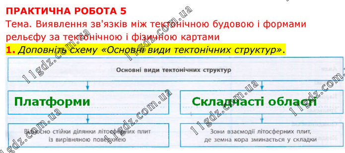 ПРАКТИЧНА РОБОТА 5 Тема. Виявлення зв'язків між тектонічною будовою і формами рельєфу за тектонічною і фізичною картами 1. Доповніть схему «Основні види тектонічних структур».
