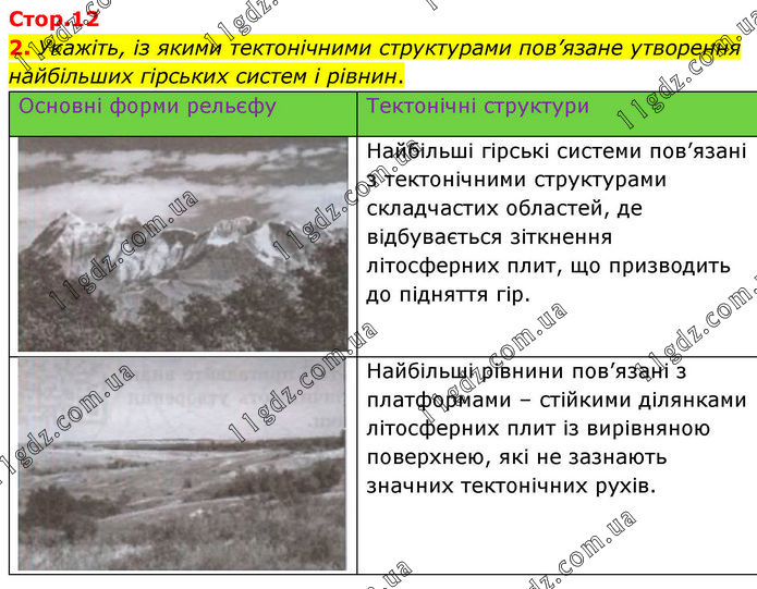 Укажіть, із якими тектонічними структурами пов’язане утворення найбільших гірських систем і рівнин. Основні форми рельєфу Тектонічні структури Найбільші гірські системи пов’язані з тектонічними структурами складчастих областей, де відбувається зіткнення літосферних плит, що призводить до підняття гір. Найбільші рівнини пов’язані з платформами – стійкими ділянками літосферних плит із вирівняною поверхнею, які не зазнають значних тектонічних рухів.