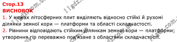 ВИСНОВОК 1. У межах літосферних плит виділяють відносно стійкі й рухомі ділянки земної кори — платформи та області складчастості. 2. Рівнини відповідають стійким ділянкам земної кори — платформи; утворення гір переважно пов’язане з областями складчастості.