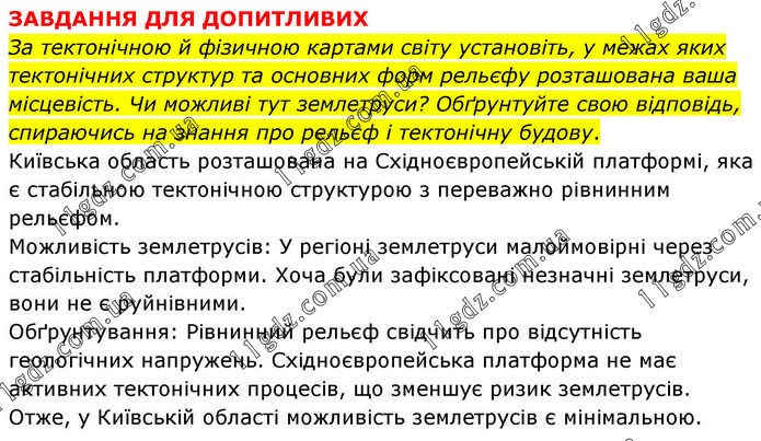 ЗАВДАННЯ ДЛЯ ДОПИТЛИВИХ За тектонічною й фізичною картами світу установіть, у межах яких тектонічних структур та основних форм рельєфу розташована ваша місцевість. Чи можливі тут землетруси? Обґрунтуйте свою відповідь, спираючись на знання про рельєф і тектонічну будову. Київська область розташована на Східноєвропейській платформі, яка є стабільною тектонічною структурою з переважно рівнинним рельєфом. Можливість землетрусів: У регіоні землетруси малоймовірні через стабільність платформи. Хоча були зафіксовані незначні землетруси, вони не є руйнівними. Обґрунтування: Рівнинний рельєф свідчить про відсутність геологічних напружень. Східноєвропейська платформа не має активних тектонічних процесів, що зменшує ризик землетрусів. Отже, у Київській області можливість землетрусів є мінімальною.