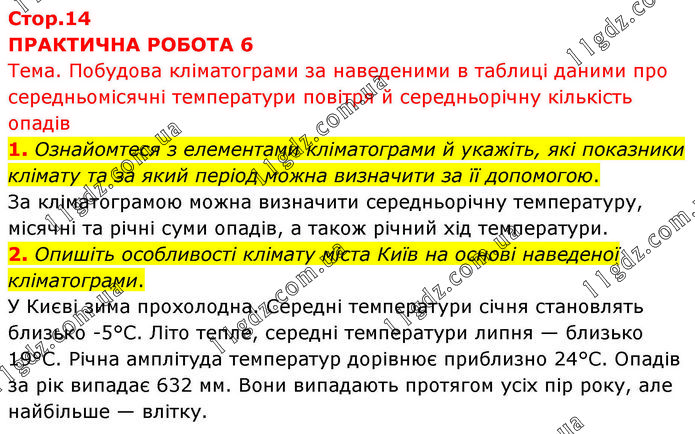 ПРАКТИЧНА РОБОТА 6 Тема. Побудова кліматограми за наведеними в таблиці даними про середньомісячні температури повітря й середньорічну кількість опадів 1. Ознайомтеся з елементами кліматограми й укажіть, які показники клімату та за який період можна визначити за її допомогою. За кліматограмою можна визначити середньорічну температуру, місячні та річні суми опадів, а також річний хід температури. 2. Опишіть особливості клімату міста Київ на основі наведеної кліматограми. У Києві зима прохолодна. Середні температури січня становлять близько -5°C. Літо тепле, середні температури липня — близько 19°C. Річна амплітуда температур дорівнює приблизно 24°C. Опадів за рік випадає 632 мм. Вони випадають протягом усіх пір року, але найбільше — влітку.
