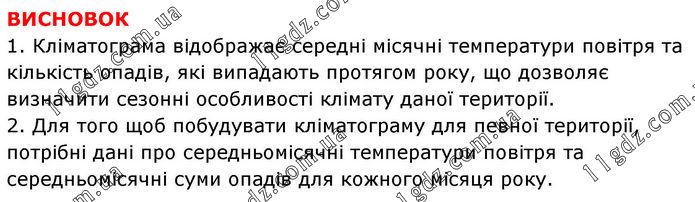 ВИСНОВОК 1. Кліматограма відображає середні місячні температури повітря та кількість опадів, які випадають протягом року, що дозволяє визначити сезонні особливості клімату даної території. 2. Для того щоб побудувати кліматограму для певної території, потрібні дані про середньомісячні температури повітря та середньомісячні суми опадів для кожного місяця року.