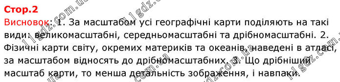 Висновок: 1. За масштабом усі географічні карти поділяють на такі види: великомасштабні, середньомасштабні та дрібномасштабні. 2. Фізичні карти світу, окремих материків та океанів, наведені в атласі, за масштабом відносять до дрібномасштабних. 3. Що дрібніший масштаб карти, то менша детальність зображення, і навпаки.