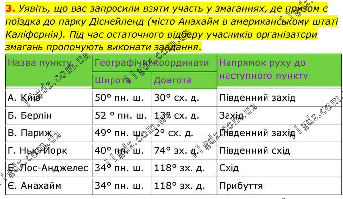 Уявіть, що вас запросили взяти участь у змаганнях, де призом є поїздка до парку Діснейленд (місто Анахайм в американському штаті Каліфорнія). Під час остаточного відбору учасників організатори змагань пропонують виконати завдання. Назва пункту Географічні координати Напрямок руху до наступного пункту Широта Довгота А. Київ 50° пн. ш. 30° сх. д. Південний захід Б. Берлін 52 ° пн. ш. 13° сх. д. Захід В. Париж 49° пн. ш. 2° сх. д. Південний захід Г. Нью-Йорк 40° пн. ш. 74° зх. д. Південний схід Е. Лос-Анджелес 34° пн. ш. 118° зх. д. Схід Є. Анахайм 34° пн. ш. 118° зх. д. Прибуття