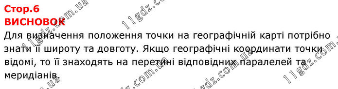 ВИСНОВОК Для визначення положення точки на географічній карті потрібно знати її широту та довготу. Якщо географічні координати точки відомі, то її знаходять на перетині відповідних паралелей та меридіанів.