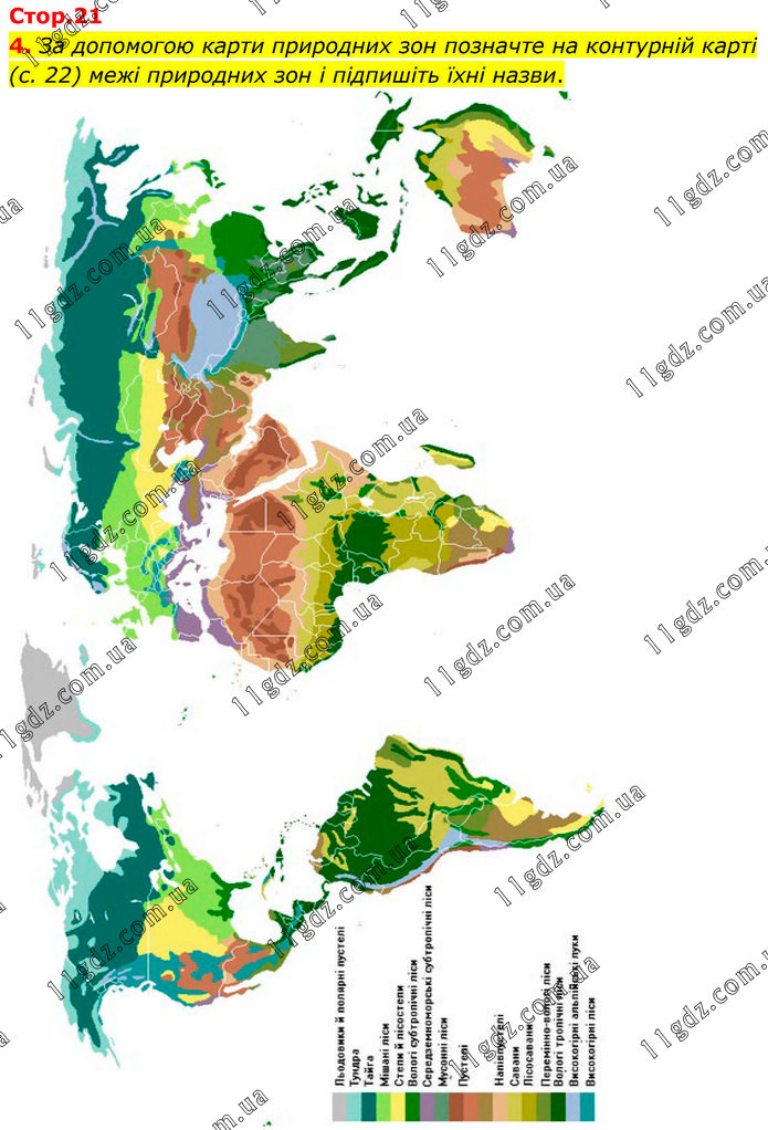 За допомогою карти природних зон позначте на контурній карті (с. 22) межі природних зон і підпишіть їхні назви.
