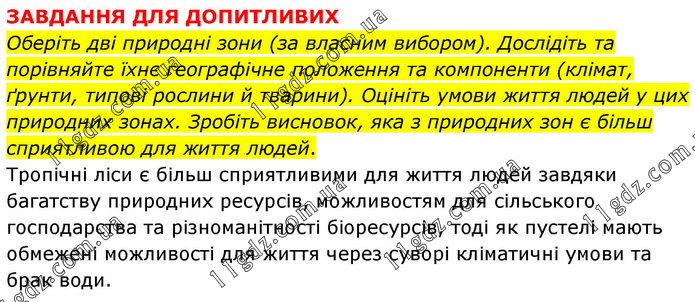 ЗАВДАННЯ ДЛЯ ДОПИТЛИВИХ Оберіть дві природні зони (за власним вибором). Дослідіть та порівняйте їхнє географічне положення та компоненти (клімат, ґрунти, типові рослини й тварини). Оцініть умови життя людей у цих природних зонах. Зробіть висновок, яка з природних зон є більш сприятливою для життя людей. Тропічні ліси є більш сприятливими для життя людей завдяки багатству природних ресурсів, можливостям для сільського господарства та різноманітності біоресурсів, тоді як пустелі мають обмежені можливості для життя через суворі кліматичні умови та брак води.