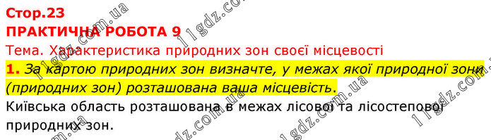 ПРАКТИЧНА РОБОТА 9 Тема. Характеристика природних зон своєї місцевості 1. За картою природних зон визначте, у межах якої природної зони (природних зон) розташована ваша місцевість. Київська область розташована в межах лісової та лісостепової природних зон.