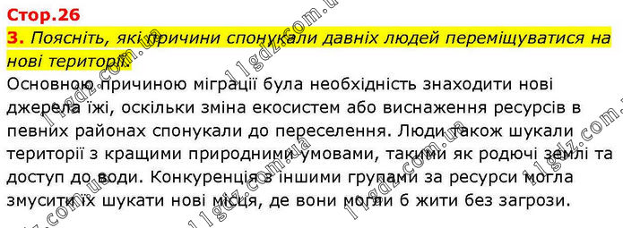 Поясніть, які причини спонукали давніх людей переміщуватися на нові території. Основною причиною міграції була необхідність знаходити нові джерела їжі, оскільки зміна екосистем або виснаження ресурсів в певних районах спонукали до переселення. Люди також шукали території з кращими природними умовами, такими як родючі землі та доступ до води. Конкуренція з іншими групами за ресурси могла змусити їх шукати нові місця, де вони могли б жити без загрози.