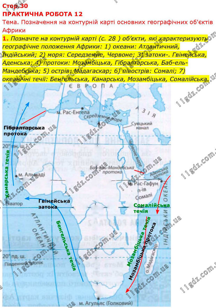 ПРАКТИЧНА РОБОТА 12 Тема. Позначення на контурній карті основних географічних об'єктів Африки 1. Позначте на контурній карті (с. 28 ) об’єкти, які характеризують географічне положення Африки: 1) океани: Атлантичний, Індійський; 2) моря: Середземне, Червоне; 3) затоки-. Гвінейська, Аденська; 4) протоки: Мозамбіцька, Гібралтарська, Баб-ель-Мандебська; 5) острів: Мадагаскар; 6) півострів: Сомалі; 7) океанічні течії: Бенгельська, Канарська, Мозамбіцька, Сомалійська.